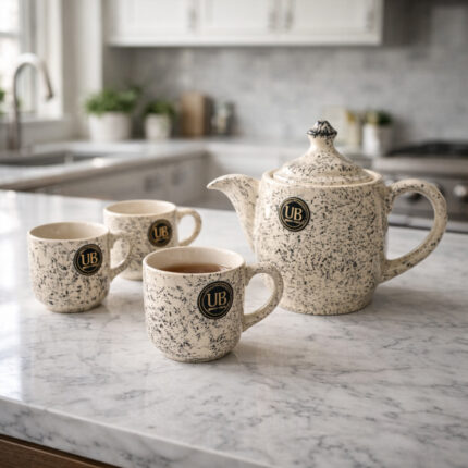 Chai Dosti Ceramic Tea Set – 9 Pieces (6 Cups, 2 Serving Plates, 1 Kettle/Teapot) | Modern Speckled Design | Ideal for Gifting & Home Decor
